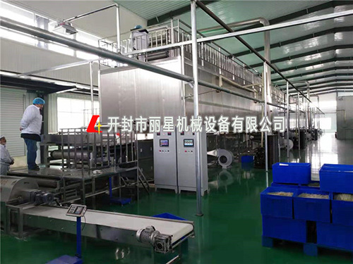 麗星紅薯粉條生產(chǎn)線采用了感應鋪漿蒸熟工藝,改變了以往燃煤加熱,采用蒸汽蒸熟,然后進行冷卻脫離,進行低溫老化,設備本身自帶了冷庫,老化后直接進入冷庫冷凍;涂布式的粉條加工設備配套了烘干裝置,不需要室外晾曬,加工粉條定長橫切,長短一致,粗細均勻,成品出機即可包裝。